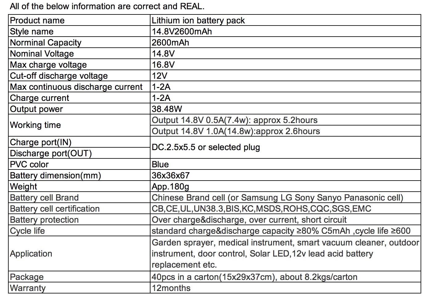 - Product name: 14.4V/14.8V2600mAh Lithium ion battery pack