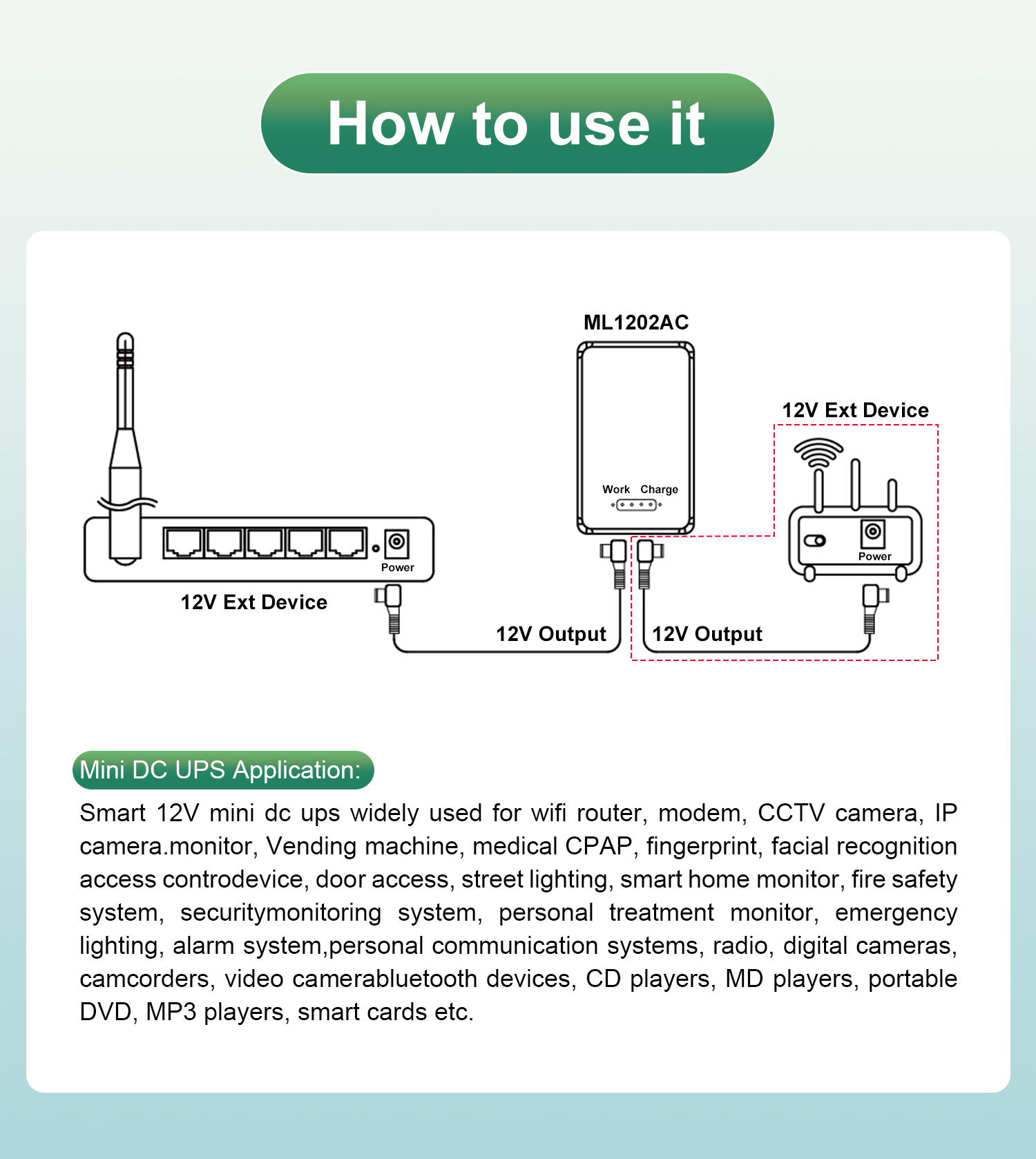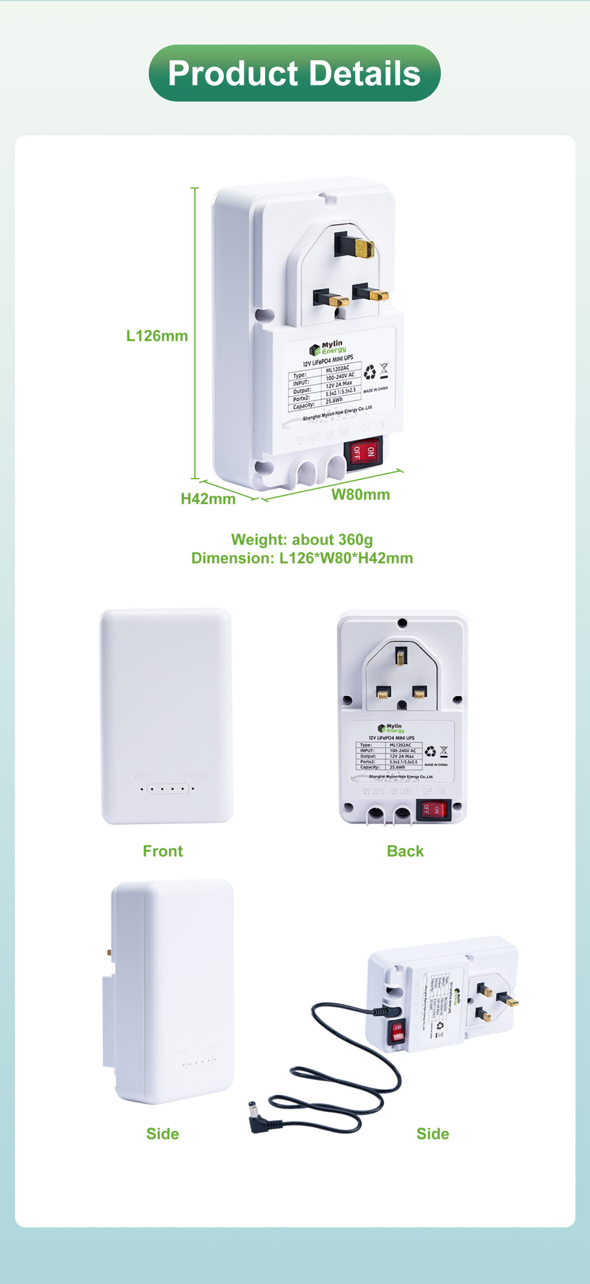 Working time | approx 4 hours backup time(if your device is 12V0.5A) |