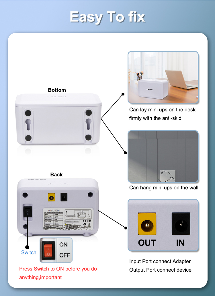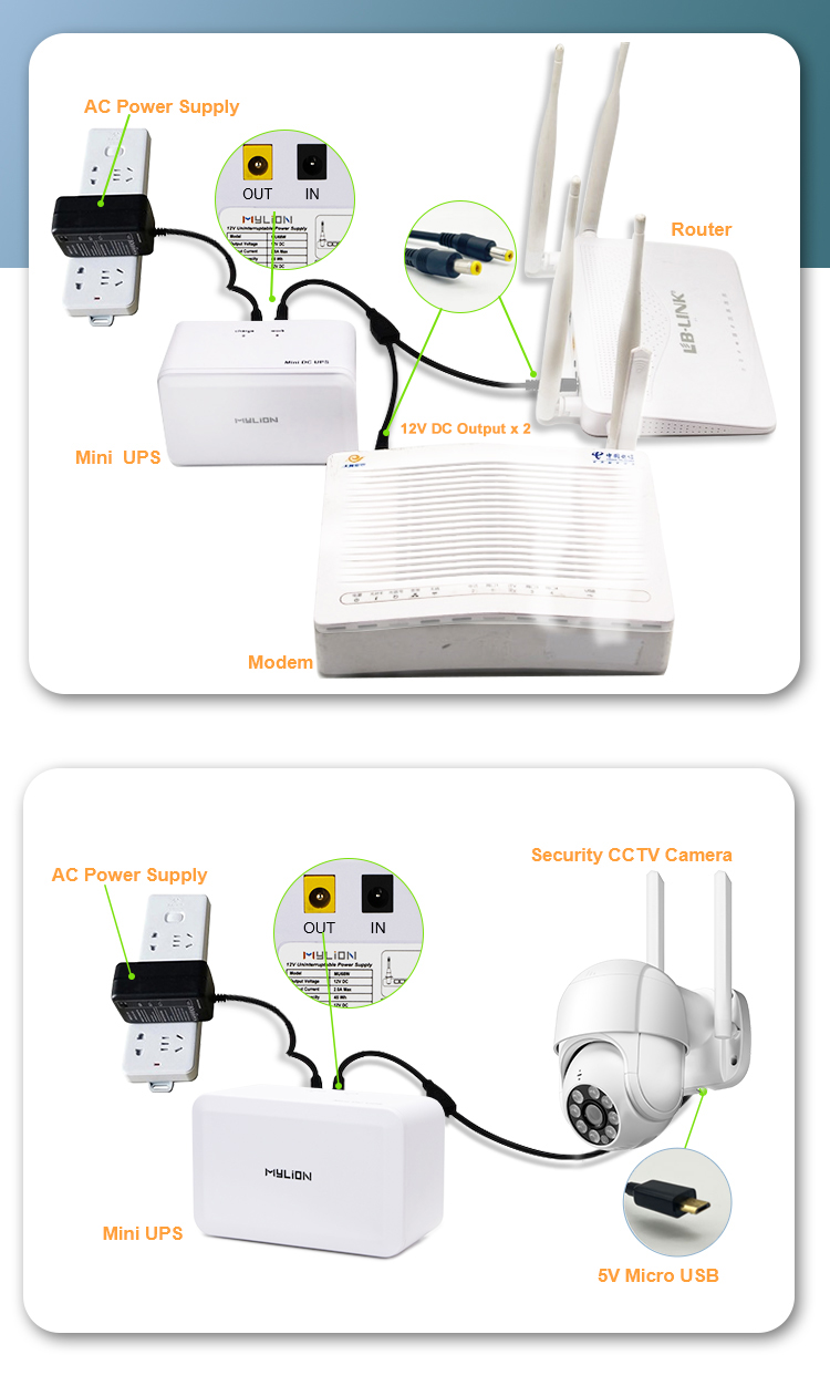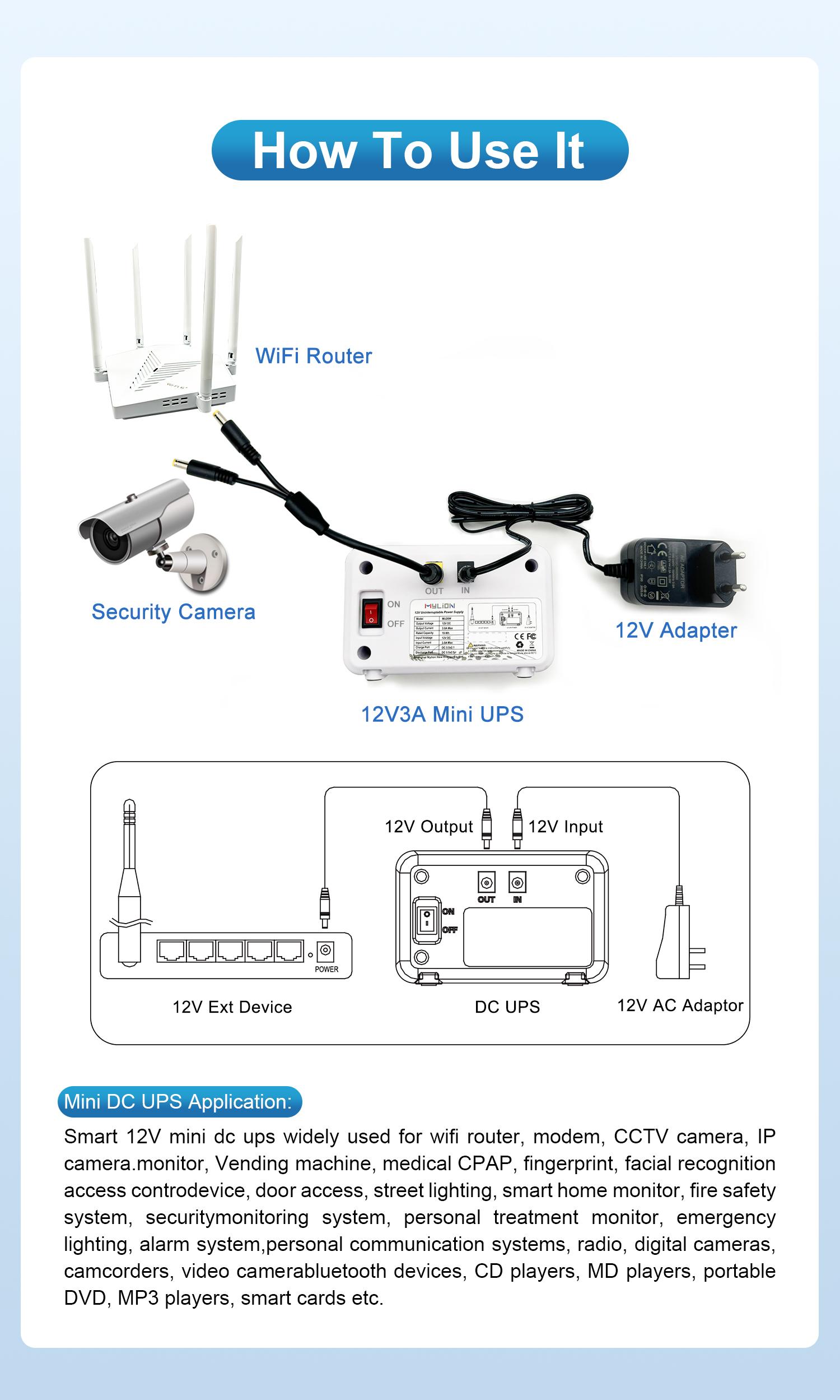 Product name | Mini DC UPS for ADSL Modem WiFi Router /Security Camera |