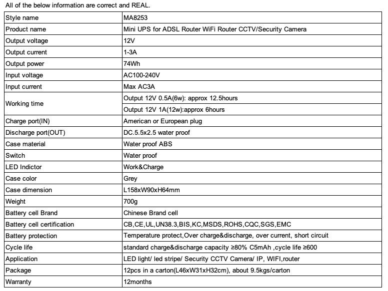 - Product name: MA8253 74Wh 100-240V IN 12V 3A OUT MINI DC UPS