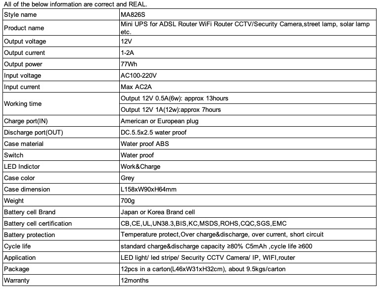 - Product name: MA826 77Wh 100-240V IN 12V 2A OUT MINI DC UPS