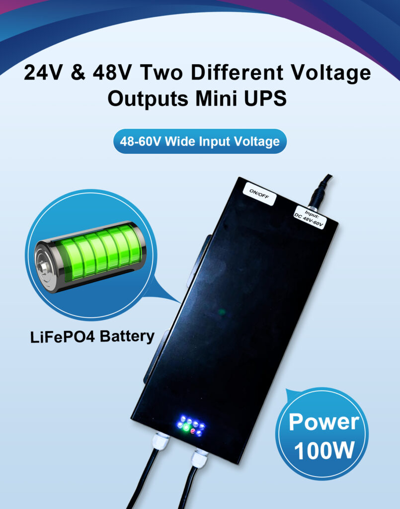 Mylion MU248 Mini UPS can provide uninterruptible power supply for 24V and 48V devices at the same time, with a maximum output power of 100W, supporting 24V/3A and 48V/1A loads. This dual voltage output design greatly improves device compatibility and can meet the needs of various industry equipment. It is particularly suitable for key applications such as telecommunications base stations, switches, and security monitoring equipment.